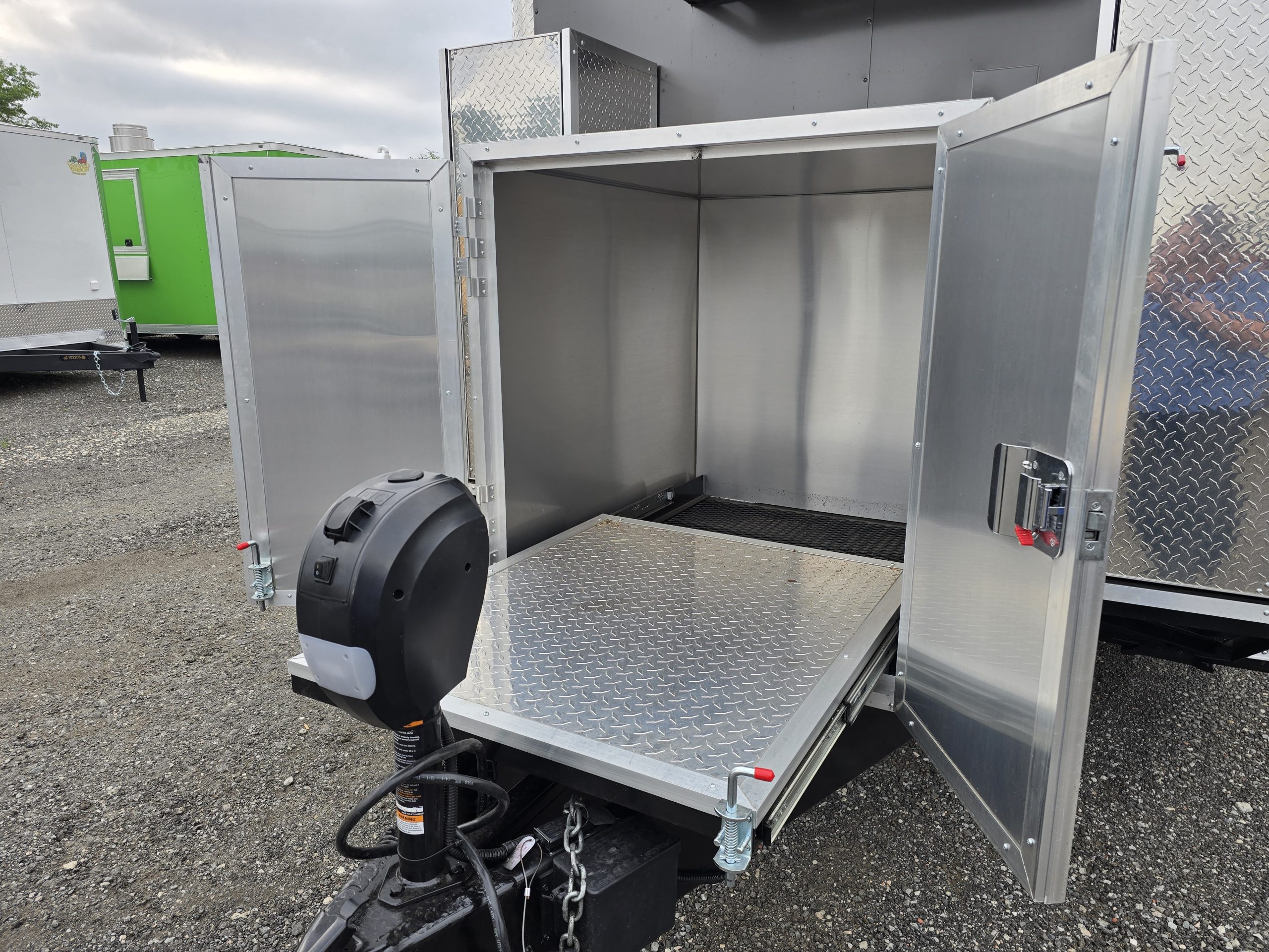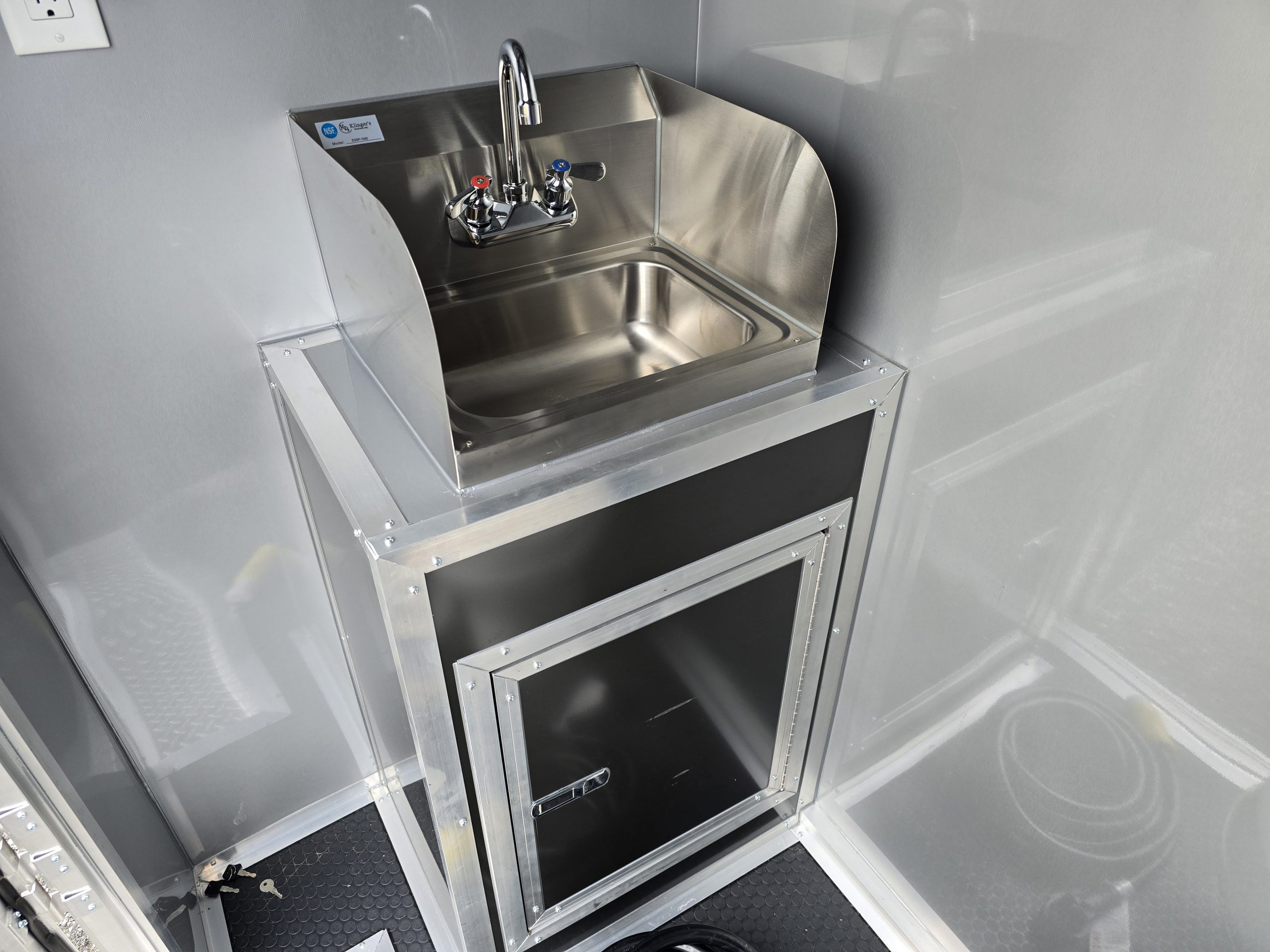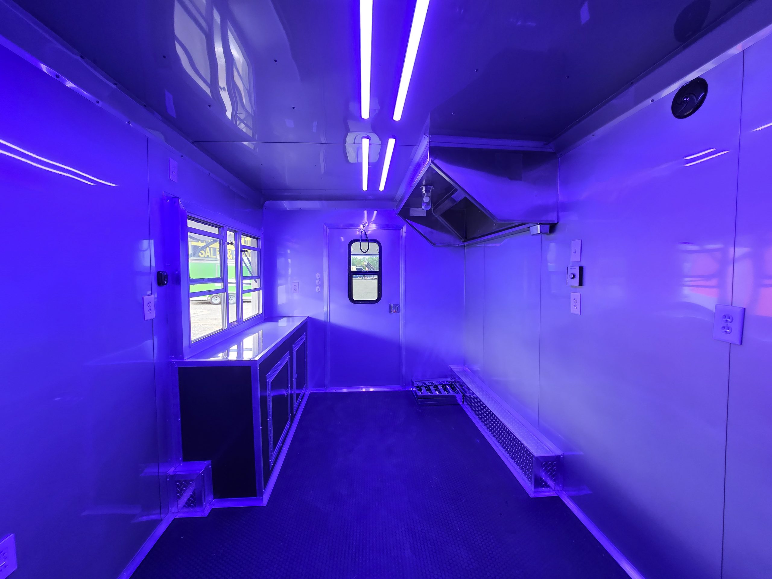 Interior Finish: Sleek silver metal walls and ceiling with rubber coin flooring