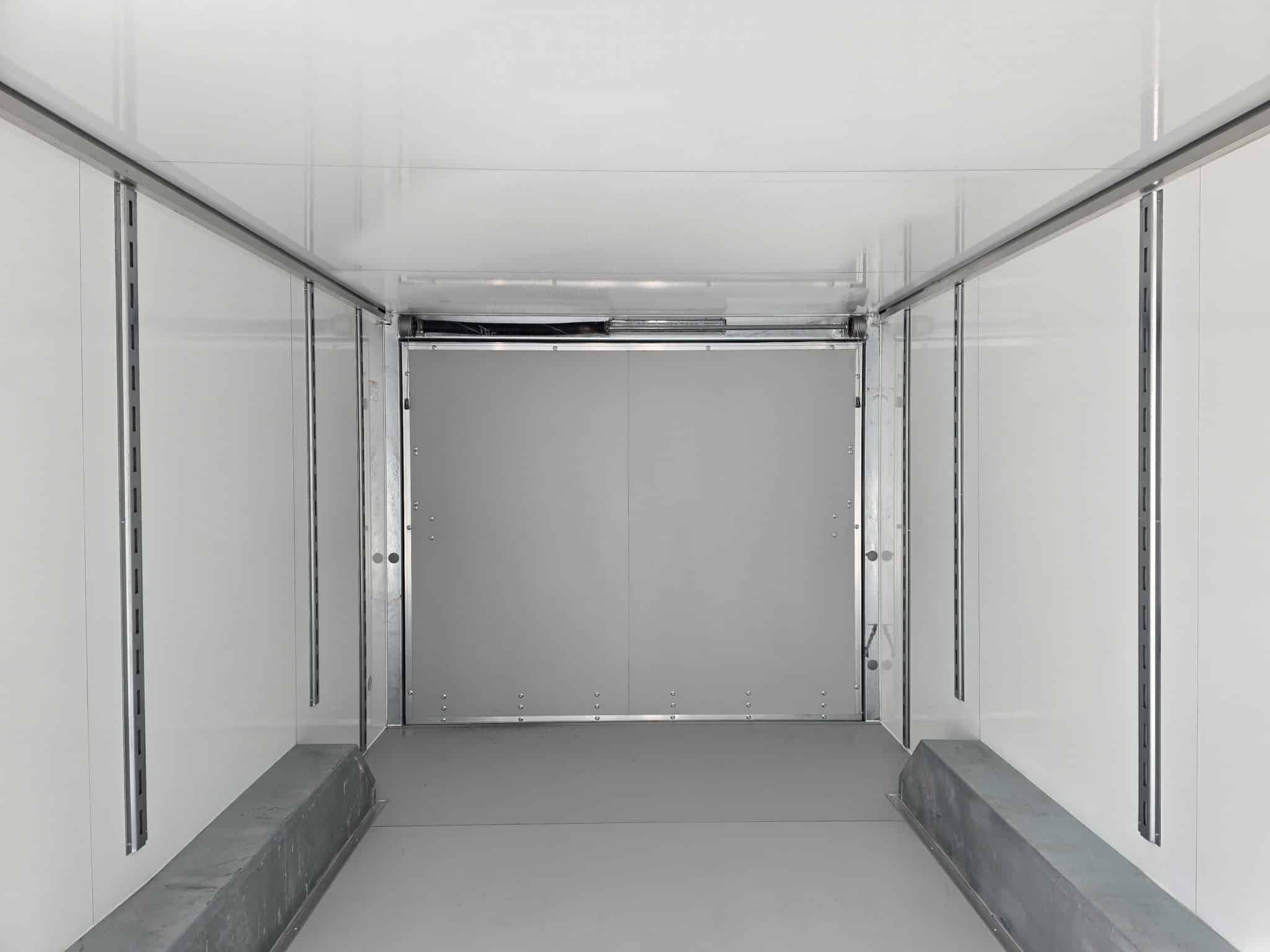 It features a rear ramp door for easy loading and unloading, along with E-Track installed in both the walls and roof to allow for flexible and secure cargo tie-downs. The interior also includes four D-rings mounted in the floor for additional load control.