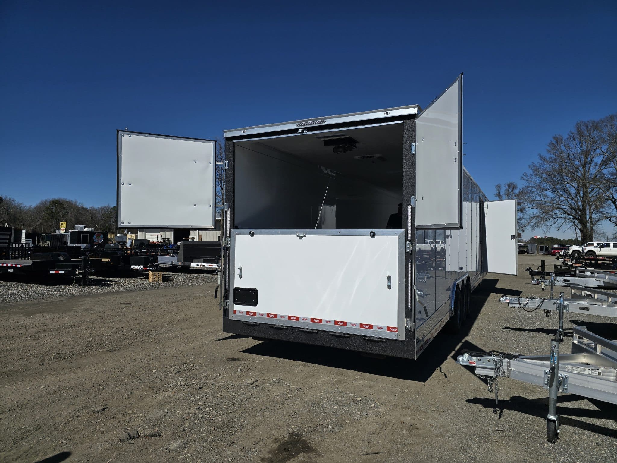 Designed for durability and convenience, it features a semi screwless exterior, triple 7,000 lb torsion axles, and multiple rear door configurations for flexible loading and unloading.